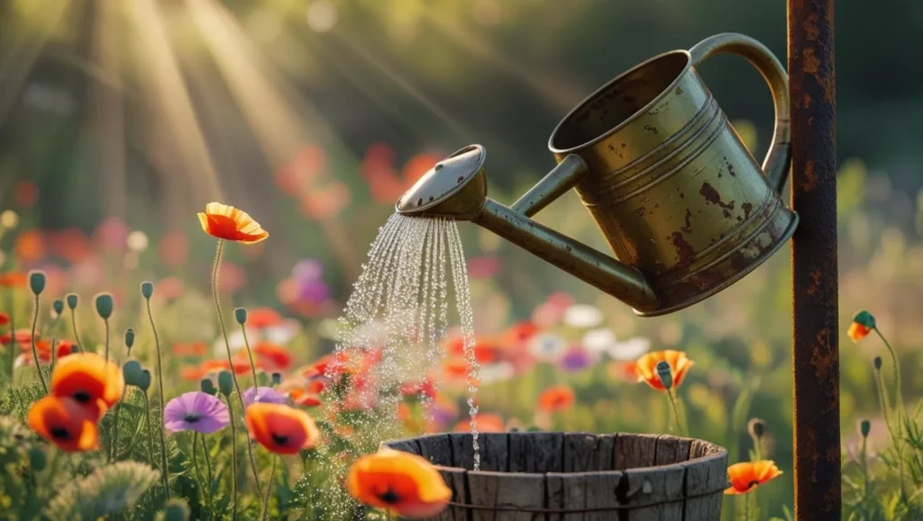 Give old watering cans a second life by turning them into whimsical garden fountains. Mounted at an angle, they can pour water into barrels, buckets, or basins below—ideal for cottagecore vibes or farmhouse gardens.